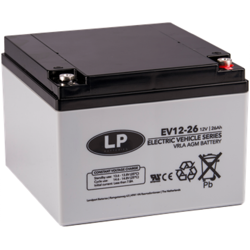 Η μπαταρία VRLA Electric Vehicle EV12-26, 12 volt, 26 Ah, προσφέρουν αξιόπιστη απόδοση σε καταστάσεις υψηλού φορτίου και έχουν υψηλή αντοχή χάρη στο ειδικό υλικό, τα ισχυρά πλέγματα και την κατασκευή παχιάς πλάκας.